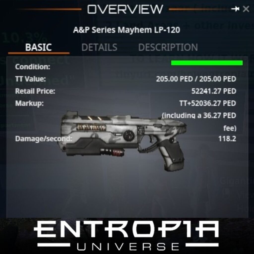 A&P Series Mayhem LP-120 เป็นอาวุธประเภทปืนพกที่มีความพิเศษในเกม Entropia Universe