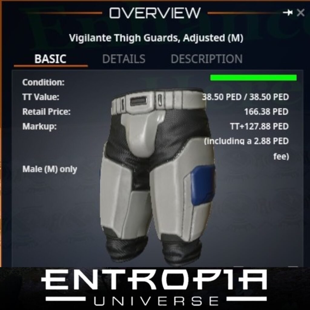 Vigilante Thigh Guards, Adjusted (M) เป็นชุดเกราะที่ออกแบบมาเพื่อเพิ่มความทนทานและการป้องกันในเกม Entropia Universe โดยเฉพาะสำหรับผู้เล่นที่ต้องการประสิทธิภาพสูงสุดในสนามรบ