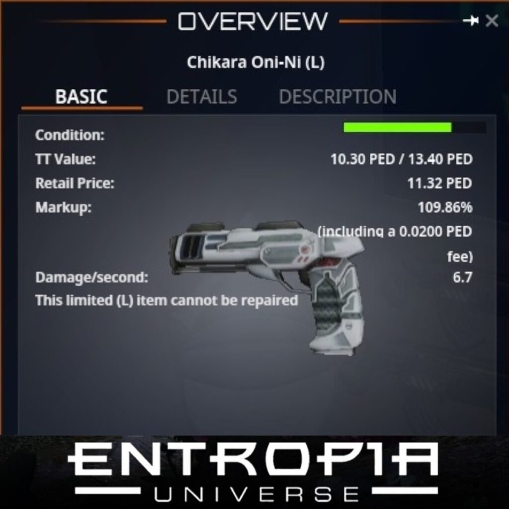 Chikara Oni-Ni (L) เป็นอาวุธปืนที่ออกแบบมาเพื่อให้ผู้เล่นในเกม Entropia Universe มีประสิทธิภาพในการต่อสู้ที่สูงขึ้น โดยเฉพาะในการโจมตีระยะกลางถึงไกล