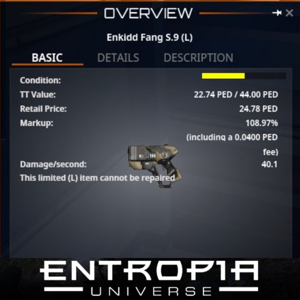 Enkidd Fang S.9 (L) เป็นอาวุธประเภทมีดในเกม Entropia Universe ที่มีคุณสมบัติที่น่าสนใจดังนี้: