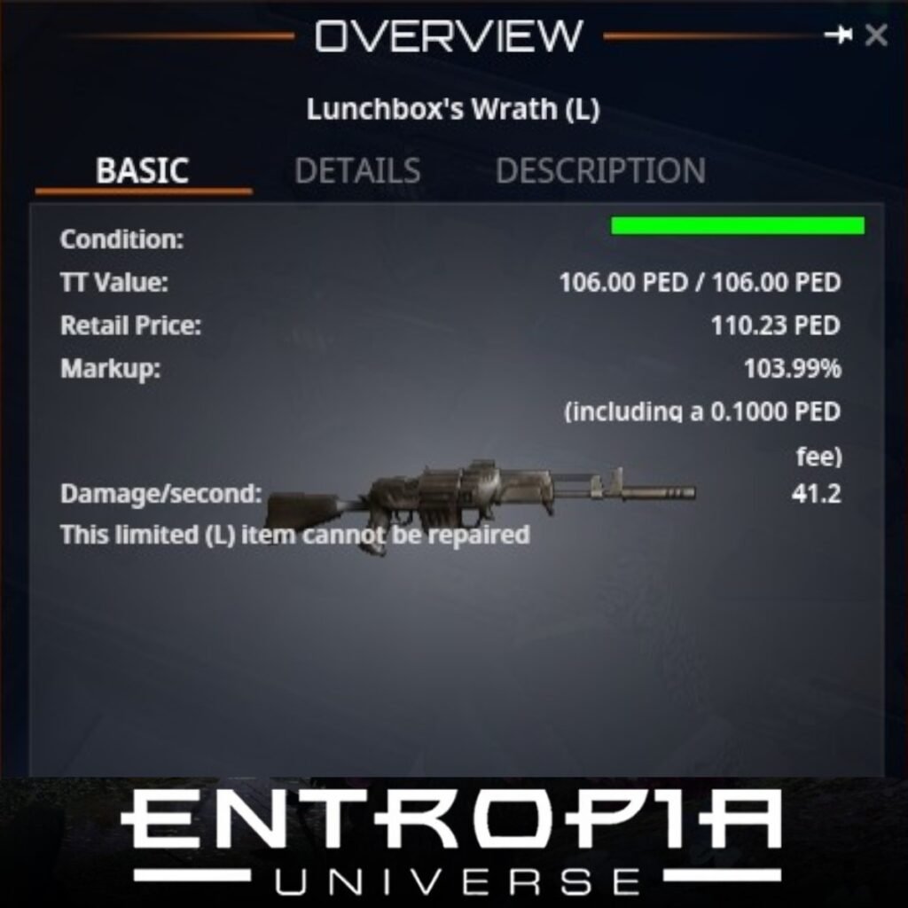 Lunchbox’s Wrath (L) เป็นอาวุธที่มีความน่าสนใจในเกม Entropia Universe ซึ่งออกแบบมาเพื่อให้ผู้เล่นสามารถต่อสู้ได้อย่างมีประสิทธิภาพ