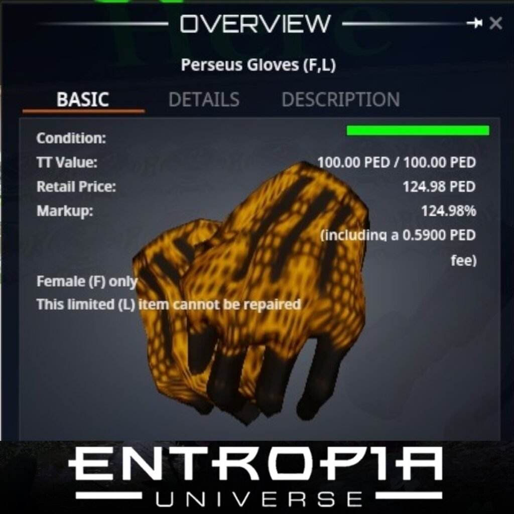 Perseus Gloves (F,L) เป็นชุดเกราะที่ออกแบบมาเพื่อเพิ่มความทนทานและการป้องกันในเกม Entropia Universe โดยเหมาะสำหรับผู้เล่นทั้งชายและหญิง