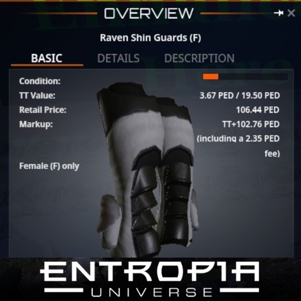 Raven Shin Guards (F) เป็นชุดเกราะที่ออกแบบมาเพื่อเพิ่มความทนทานและการป้องกันในเกม Entropia Universe โดยเฉพาะสำหรับผู้เล่นหญิง