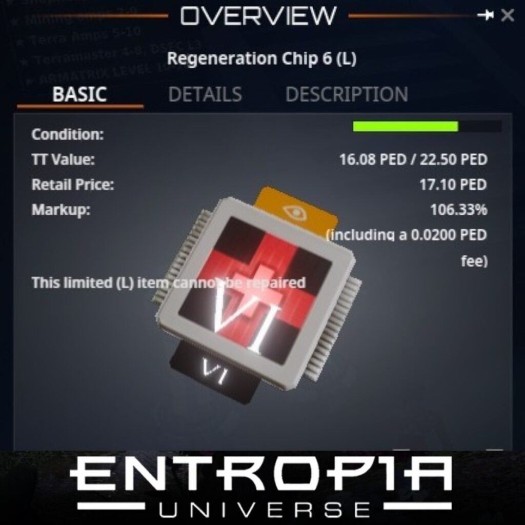 Regeneration Chip 6 (L) เป็นชิป Mindforce ที่ใช้ในการฟื้นฟูพลังชีวิตในเกม Entropia Universe มีคุณสมบัติที่สำคัญดังนี้: