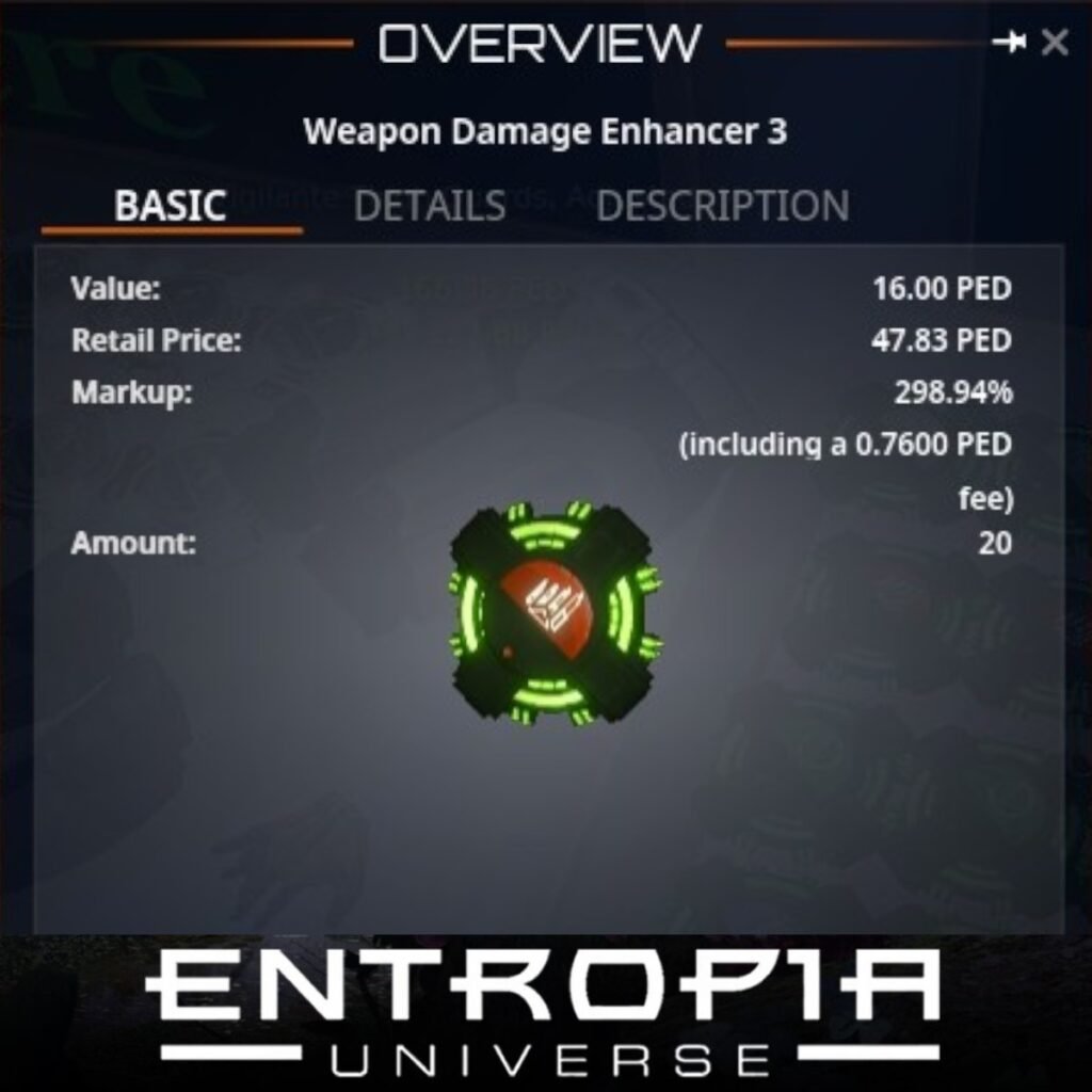 Weapon Damage Enhancer 3 เป็นอุปกรณ์เสริมที่พัฒนาขึ้นเพื่อเพิ่มความเสียหายที่เกิดจากการโจมตีของอาวุธในเกม Entropia Universe โดยมีความสามารถในการทำลายล้างที่สูงขึ้น เหมาะสำหรับผู้เล่นที่มุ่งหวังจะเพิ่มพลังโจมตีและประสิทธิภาพในการต่อสู้