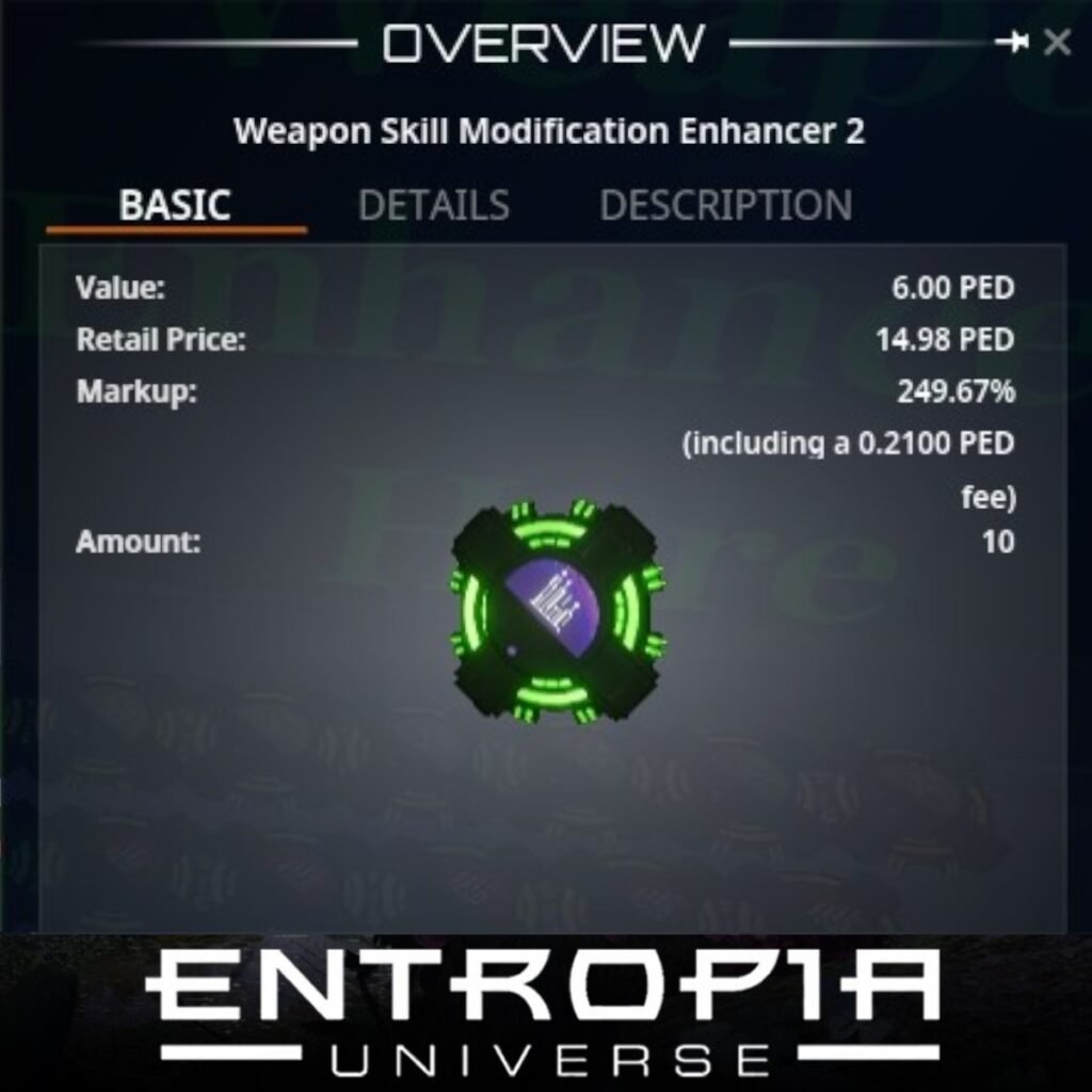 Weapon Skill Modification Enhancer 2 เป็นอุปกรณ์เสริมที่ช่วยเพิ่มความสามารถในการใช้ทักษะอาวุธของผู้เล่นในเกม Entropia Universe โดยเฉพาะในการปรับปรุงประสิทธิภาพการโจมตีให้ดียิ่งขึ้น