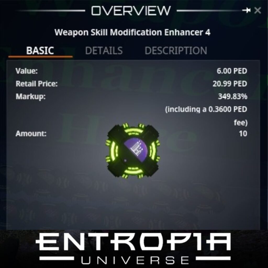 Weapon Skill Modification Enhancer 4 เป็นอุปกรณ์เสริมที่มีประสิทธิภาพสูงในการปรับปรุงทักษะการใช้อาวุธของผู้เล่นในเกม Entropia Universe ช่วยให้การโจมตีมีความแม่นยำและมีประสิทธิภาพมากยิ่งขึ้น